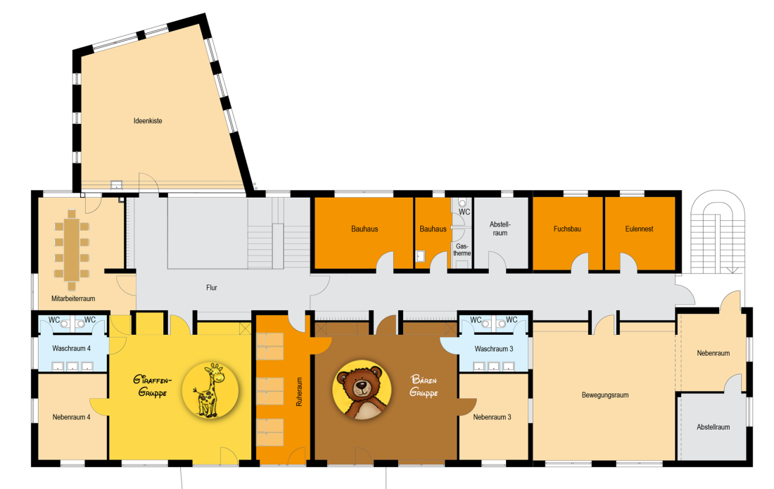 Per Mausklick auf die Gruppenräume erhalten Sie weitere Informationen zu den Gruppen, für Infos zu den Räumen im Obergeschoss klicken Sie bitte auf die Zeile Obergeschoss.